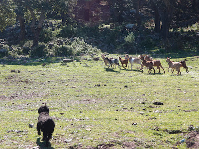 Le comenté que Violeta no había pastoreado nunca y que no la veo con aptitudes para ello porque las veces que se ha cruzado con un ganado ha pasado por completo y me respondió: no hay turco malo sino mal pastor. Se ofreció a darnos un breve cursillo acelerado de pastoreo.Yo no se lo que Violeta vió en este viejo pastor. Tal vez su seguridad y control de la situación en todo momento de él y de su feucho perro que pastoreaba que hizo que se lanzara a por el ganado. Con las ovejas y cabras se arrancó. Con los cerdos fue otra historia...